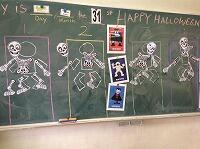 5回まわって、目をつぶったまま自分の人体パーツを黒板に貼り付けるゲームです。