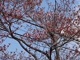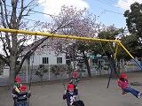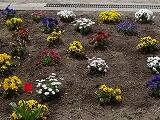 西側のハナミズキもピンクの花を付けています。 花壇にはパンジーやノースポールが