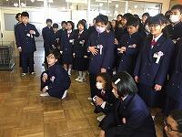昇降口で、「卒業おめでとう」の胸章をつけ、