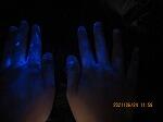紙芝居で手洗いの大切さを学習した後、ローションを手に塗り、ブラックライトを使って、洗い残しの場所を確認しました。