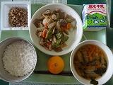 今日のメニューは、ごはん、牛乳、ポークカレー、小松菜のソテー、フルーツヨーグルトです。食材の人参は栃木市産でした。