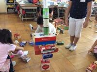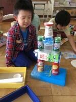 おうちからいろいろな材料をもってきてくれて、子どもたちは楽しく紙粘土にぺったんしました。