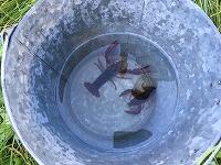 ザリガニがいそうなところを見定めて、釣りあげます。