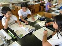 本物のメダカをスケッチしながら、教科書も参考にして、見分け方を調べていきます。