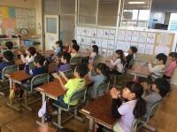 朝、読み聞かせをしてくださる、九輪草の会の方に、「大人っぽくなってきたね。」「元気で明るくていいね!」と言ってもらえた1年生。