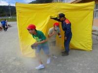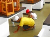体育館フロアに置かれた60枚のカード(青い面と赤い面になってます)を