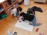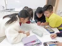 校外学習で見学してきた地域のお店や工場などについて、4つの班に分かれて模造紙にまとめています。