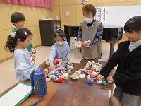 5つのグループに分かれて、竹とんぼ、こま、おはじき、お手玉、あやとり、けん玉を