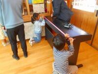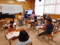 1年生は音楽室で、カスタネットやトライアングル、タンバリンなどを使って学習していました。