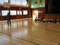 3・4年生は、体育です。体育館で高跳びの運動を行っていました。助走をつけて片足で踏み切って跳ぶ練習です。