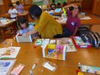 2年生も、図工です。校外学習の様子を描いていました。宇都宮動物園に行ったので動物が画用紙の中心になっています。1年生の時の絵と比べると、成長が感じられました。