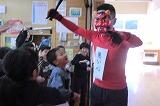 各クラスに赤鬼、青鬼が登場すると、「きゃー」と言う声や「おりゃー」・「鬼は外」という大きなかけ声とともに、子供達は一斉に鬼に向かって豆を投げていました。