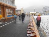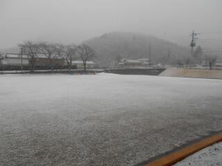 給食を食べている頃からどんどんと雪が降ってきました。校庭も白くなってきています。