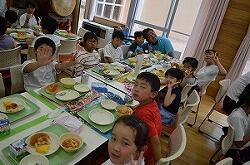 多目的室に全校児童が集まり、楽しく給食を食べました。
