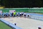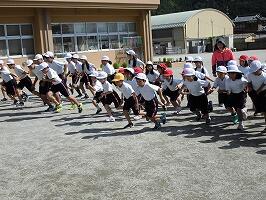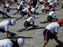 はじめに、運動委員会のリードで準備運動、次に5分間走で持久力アップ、
