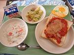 『ピザトースト、クラムチャウダー、キャベツのソテー、みかんゼリー、牛乳』