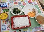 『三色丼、なめこ汁、カスタードプリン、牛乳』の和食メニューです。自分たちで考えたおいしい給食に今日も大満足の6年生でした。