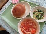 メニューは、『ミルクパン、ハンバーグ、ミネストローネ、野菜のソテー、いちごのムース、牛乳』です。