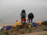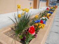 校庭の桜だけでなく、花壇の花々も新入生を出迎えました。