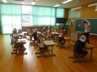 全校放送を使って校内で行いました。各教室に待機していた児童は、竜巻の接近に備えて、窓がない又は窓が一つしかない教材室や更衣室に避難しました。どの学年も、放送をよく聞いて、落ち着いた態度で訓練を行うことができました。