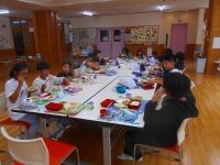 5年生の皆さんが、一階多目的室で仲良く給食を食べていました。