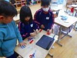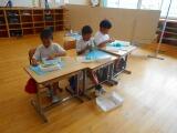 5年生は、算数です。算数の授業は2名の先生で教えています。体積の勉強です。まずは、実際に形の違う箱を一人一人作っていました。さて、どっちが大きいでしょうか?
