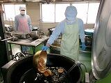 シチューの中 にはゆでた大豆 が入 っています。大豆 は体 を作 るたんぱく質 が多 く含 まれています。