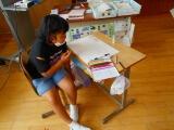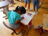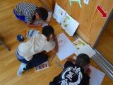 同じく、1時間目の3年生の教室。物語を読み取る学習のまとめとして、印象的なシーンの絵を描いた画用紙の裏に感想を書いた作文を貼ったものを作成していました。終わった人は、発表の練習です。授業参観で発表する予定です。楽しみにしていてください。クリエィティブで素敵ですね。