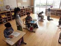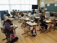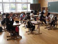 登校直後の教室を訪れてみると、1年生の教室に3人の6年生がサポートに来ていました。