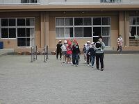 学級ごとに避難して、体育小屋の前に整列します。
