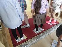 訓練終了後は、6年生が用意してくれた雑巾で上履きの土ぼこりを落として教室に向かいます。