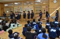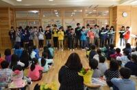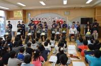 6年生からも合奏のプレゼントのお返しをもらい、その迫力に聞き入る下級生。1、2年生と6年生が手をつないで退場し、会が終了です。