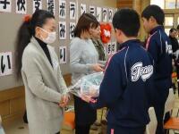 最後に、1~5年生が協力して作った写真つきメッセージカードとしおり、お花をプレゼントすると、とても嬉しそうな6年生。そして、今までお世話になった感謝の気持ちをみんなで伝え、温かい雰囲気になりました。