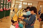 1年生はまずアーチをくぐって入場し、前の席に並び、上級生から歓迎の言葉や冠のプレゼントをもらいました。その後、なかよし班で実行委員が準備してくれた、ゲームを楽しみました。