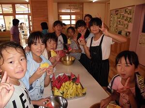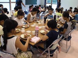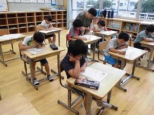 今日のサマープランでは、下学年は「学習」、上学年は「陸上」の後、活動場所を近くの寺尾公民館に移しました。