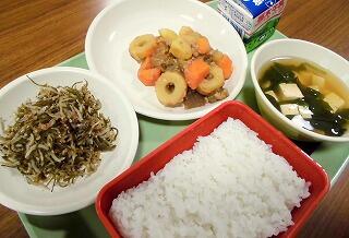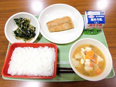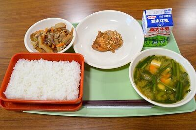 今日の献立は、「ご飯・牛乳・鶏肉のごまだれ焼き・五目きんぴら・にらと豆腐のみそ汁」です。