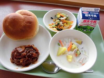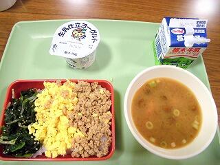 今日の給食のメニューは、「三色どん、牛乳、なめこ汁、ヨーグルト」です。