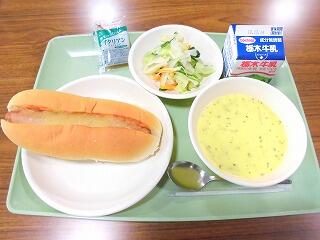 今日のメニューは、「ピザドック・牛乳・コーンポタージュ・イタリアンサラダ」です。