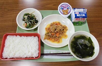 「韓国風まぜごはん・牛乳・ナムル・わかめスープ・ブルーベリーゼリー」です。