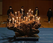 子どもたちは、火の神様から「友情の火」や「思いやりの火」、「努力の火」など、意味にある火を受け、ろうそく台に灯された炎を見つめながら、2日間を振り返りました。