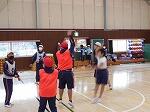 5・6年生の体育はバスケットボールで、試合形式のゲームを行い、男女ともに白熱した戦いとなっていました。