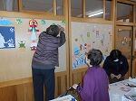 今日は、寒い中、地域のボランティアの皆様にお越しいただき、月ごとの壁面装飾を行っていただきました。1月の飾り付けは縁起物と、楽しい冬の遊びです。向かって左の縁起物は、下が空いていますが、子どもたちが登校したら絵馬に願いを書いて貼って完成です。右はスキーやたこあげを行っています。