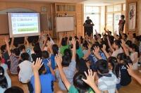 始めに多目的室に集まり、全学年一斉に竜巻に関する話を聞き、