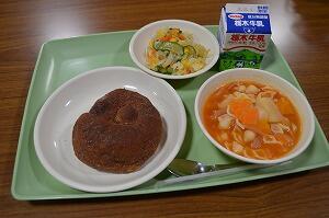 米粉のあげパン、牛乳、ゆで野菜サラダ、ミネストローネスープ