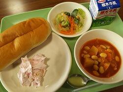 「フルーツクリームサンド・牛乳・チキンビーンズ・こんにゃくサラダ」です。