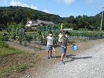 2年生は学校農園の野菜に水やりを行い、キュウリやとうもろこしを収穫しました。
