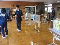 昼休み、図書室前のオープンスペースで選挙管理委員の生徒が明日の生徒会選挙の会場を準備していました。