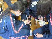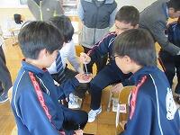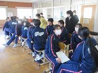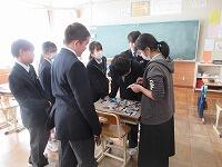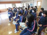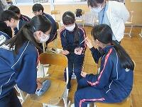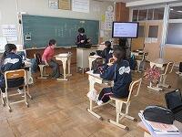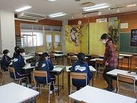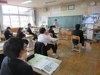 2年生は、家庭科です。先生を中心にみんなで集まっています。赤ちゃんが少しずつ成長していく写真を見ながら子供の成長の過程を学んでいました。