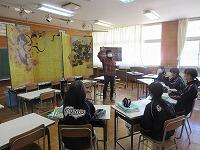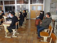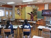 1年生は、美術です。鑑賞の授業でした。先生が用意した実物大の「風神雷神図屏風」の絵をみんなでじっくり見て、感じたことや思ったことを自由に言い合います。先生が生徒の意見を促すように生徒に問いかけていました。じっくり見るといろいろと想像が膨らみます。また、友達の意見を聞くことでよりイメージが広がっているようです。