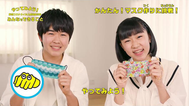 先日ご紹介しました「子供の学び応援サイト」(HP左にバナーあり)にも掲載されている【マスクを作りたい!】というコンテンツをご紹介いたします。 【マスクを作りたい!】では、「手作りマスクの作り方」や「新型コロナウイルスから身を守る方法や他人にうつさないために心がけることをわかりやすく紹介する動画」、「新型コロナウイルス感染症対策に対応する布製マスクの洗い方動画」が公開されています。下の画像から動画を見ることができますので、必要に応じてご活用ください。 <マスクの作り方> <マスクの洗い方>